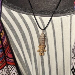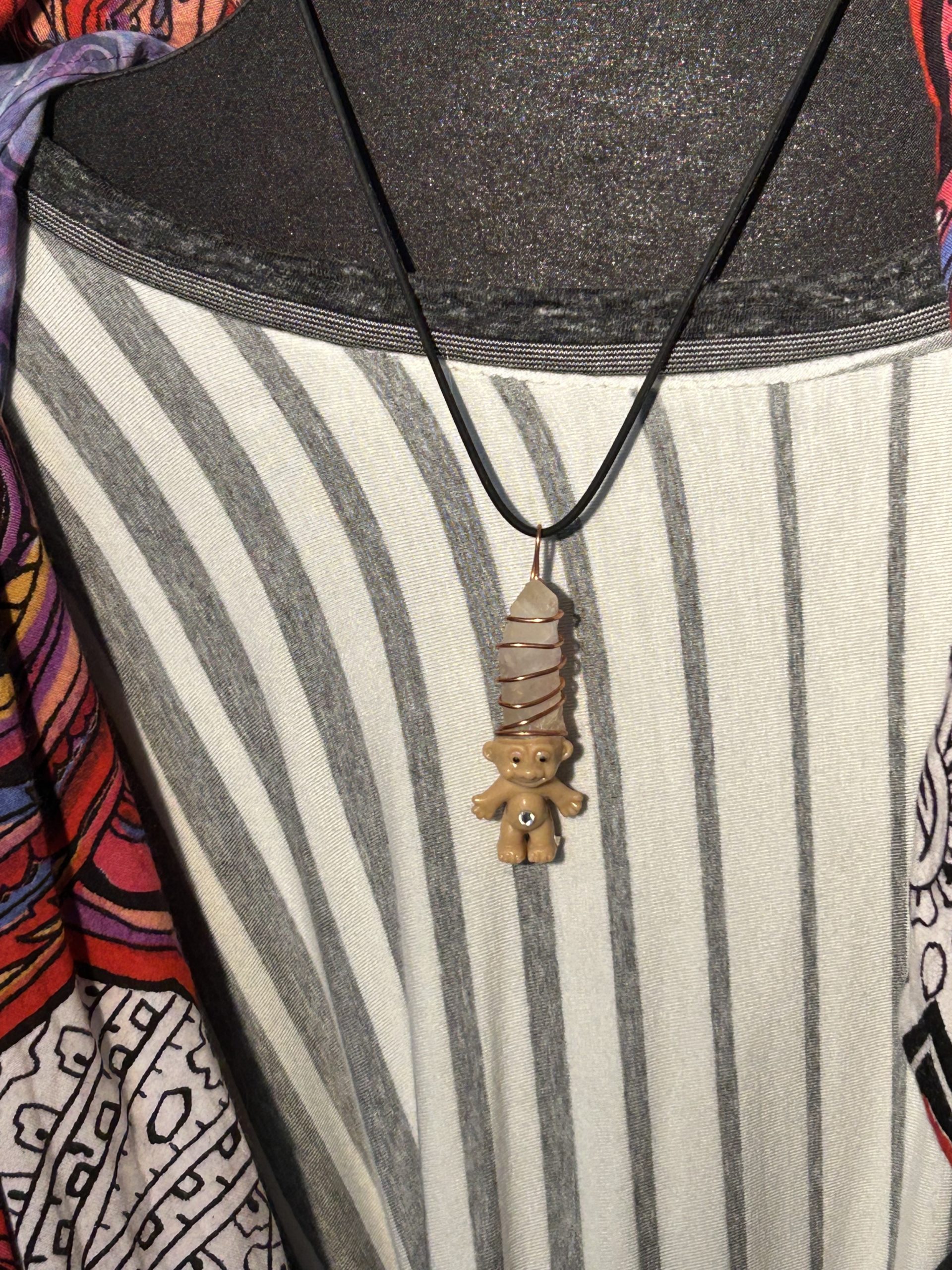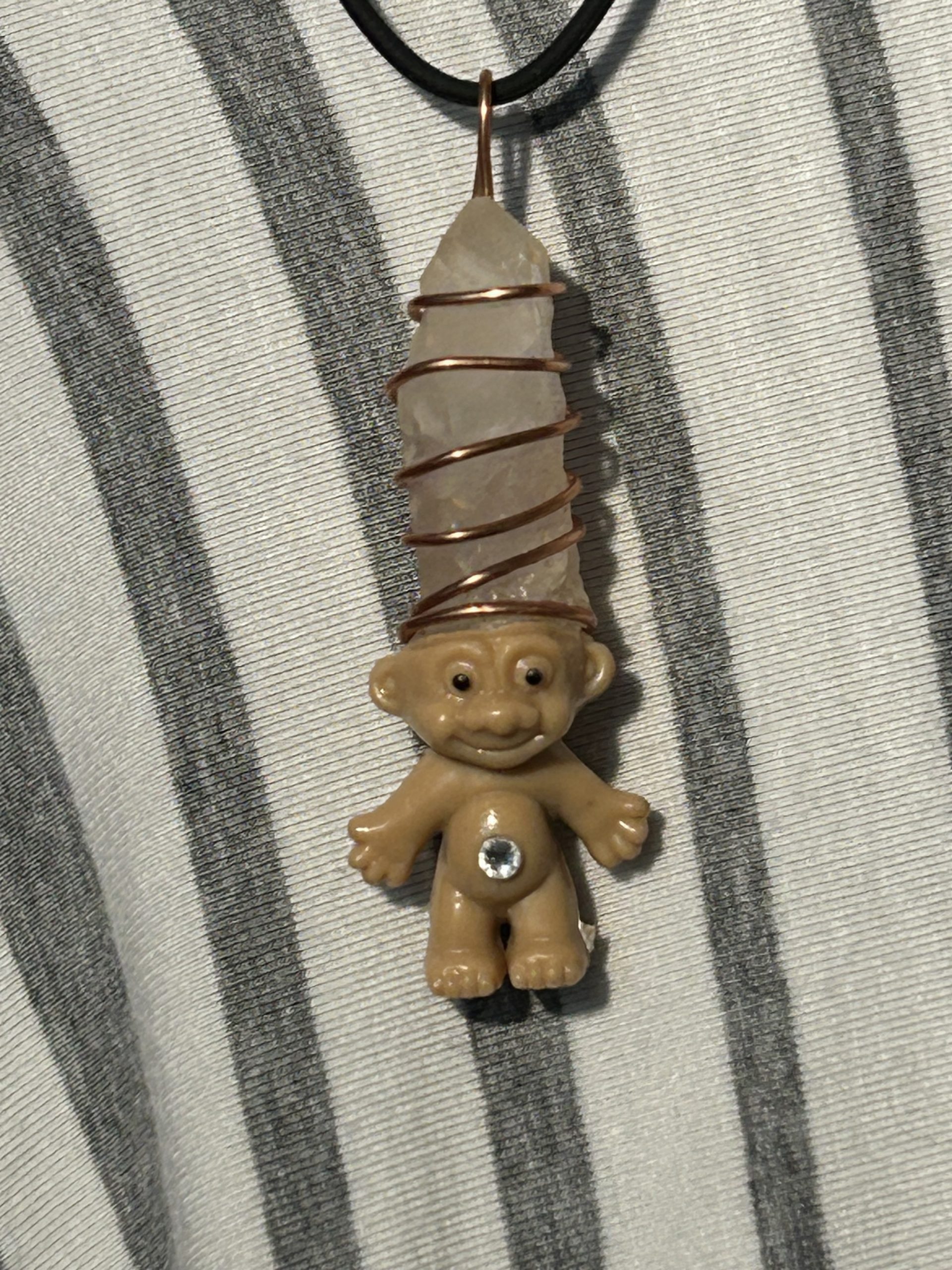 This Magic Crystal Troll is attached to a 18″ cord. In place of hair there is a Crystal Quartz wrapped with a copper wire. And a little bling on the Trolls bellybutton.
