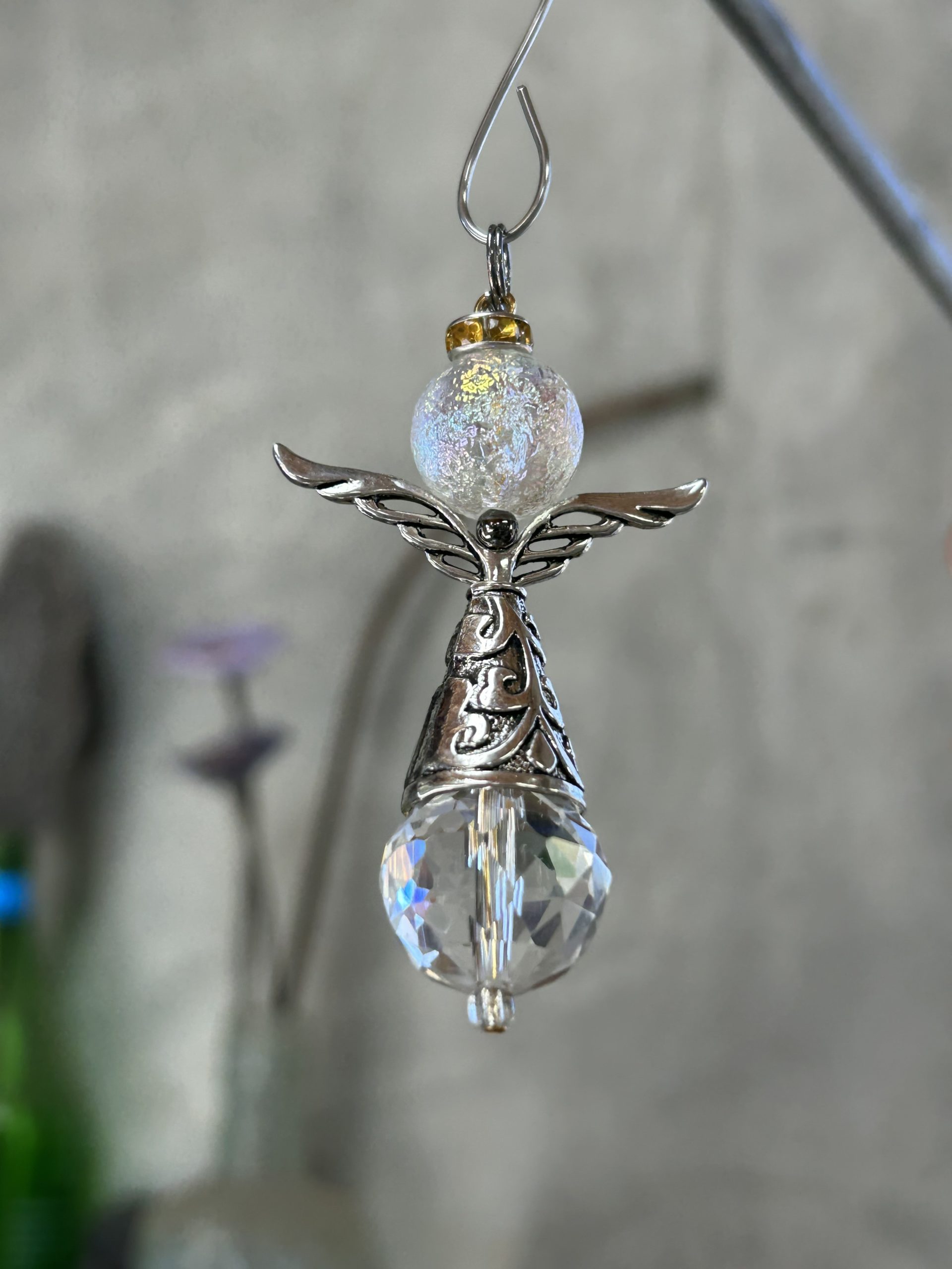 This Handmade Angel has a Prism body and when hung in the Sun you will see Rainbow Sparkles.